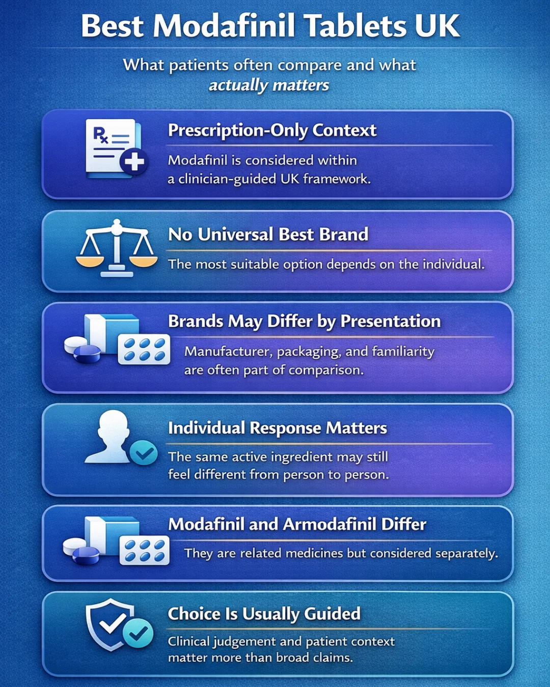 Another important point is that individual response can vary. That does not mean every product is fundamentally different, but it does explain why the idea of the best Modafinil tablets UK readers search for is usually tied to suitability rather than a fixed league table.