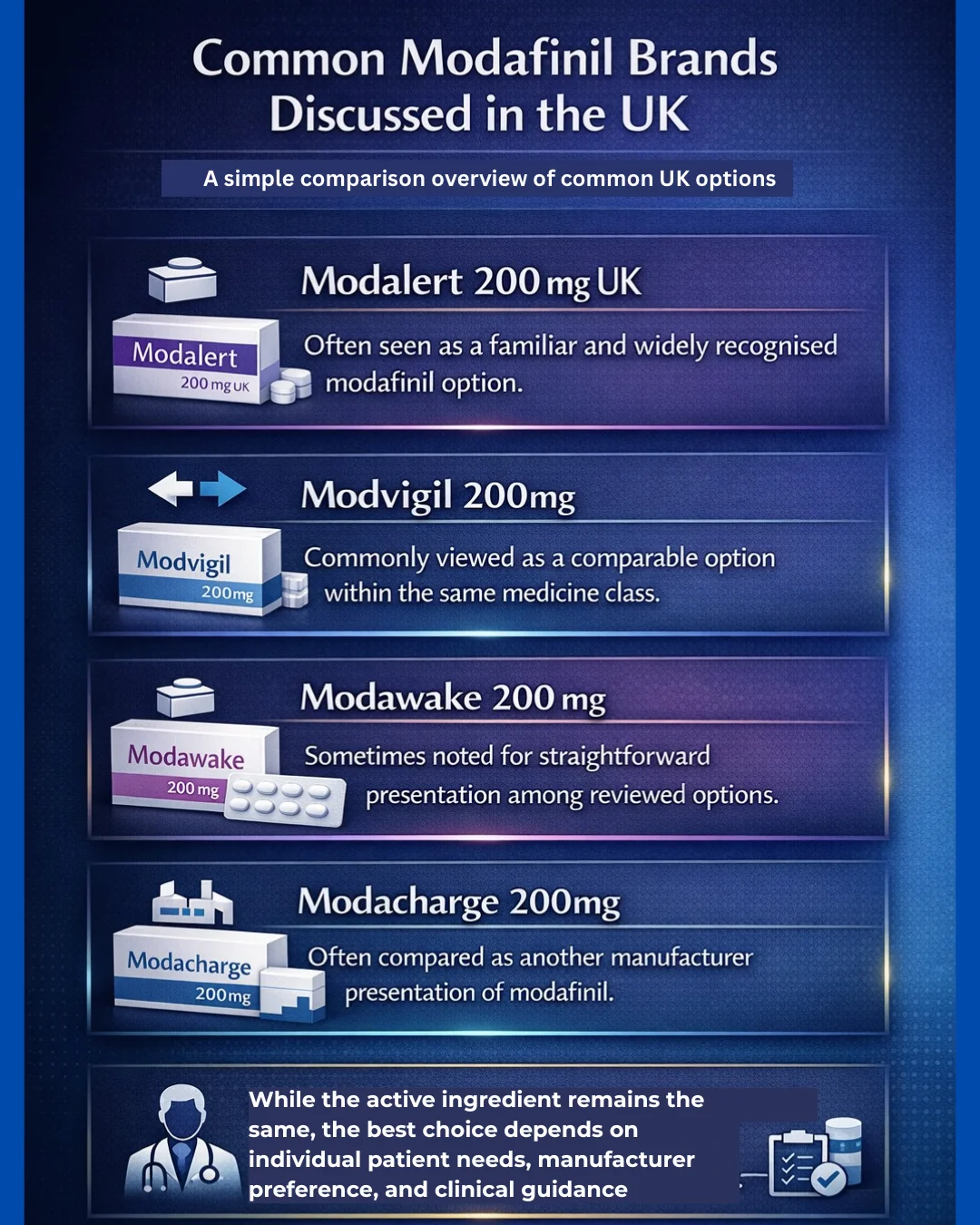 Several modafinil brands are commonly mentioned in UK-focused comparisons. These products are usually compared by brand presentation, manufacturer familiarity, and how often they appear in patient browsing or review-style discussion.