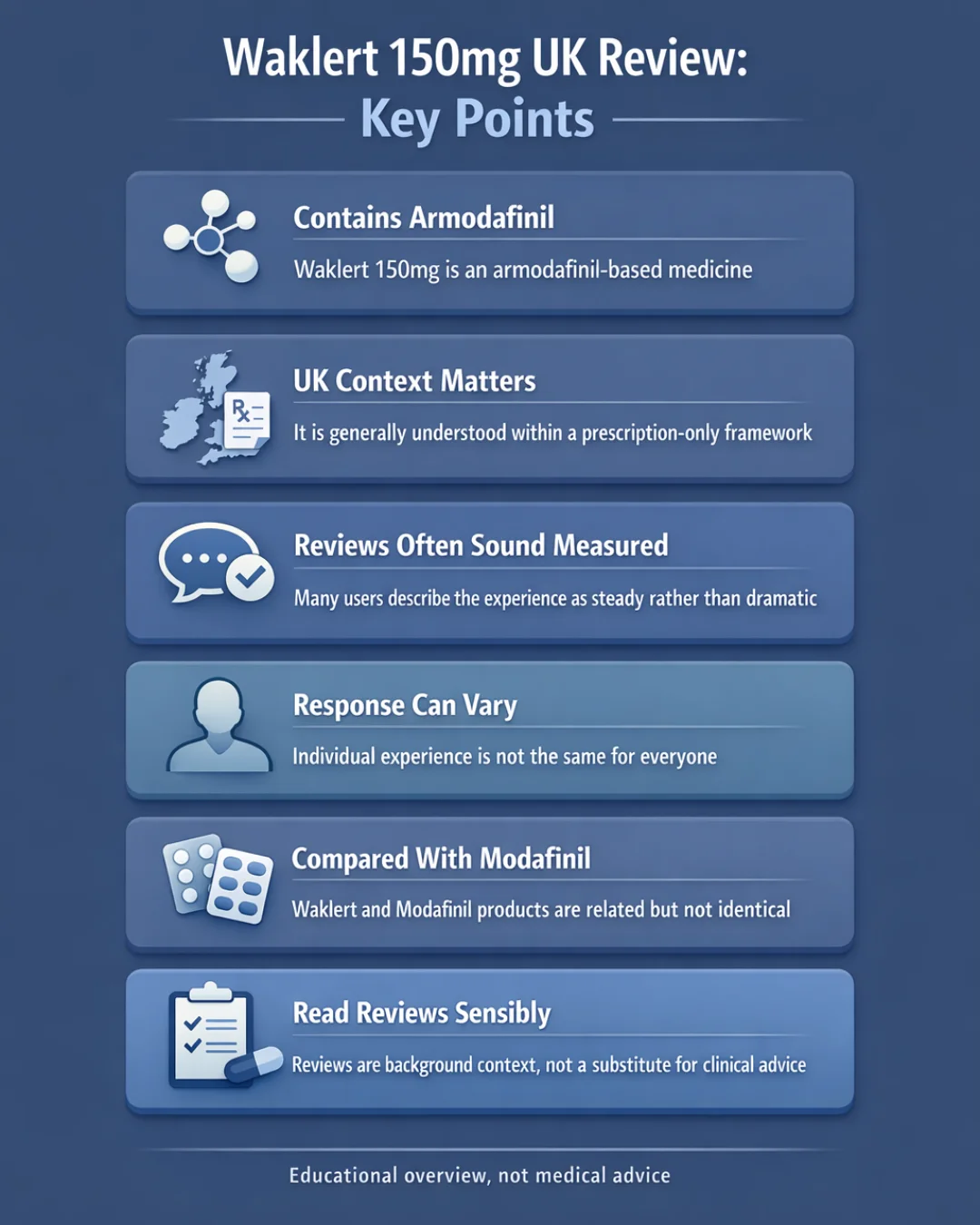 This Waklert 150mg UK reviews is provided for informational and educational purposes only. It is not medical advice and should not be relied on as a substitute for advice, diagnosis, or treatment from a qualified healthcare professional. Readers should speak with a doctor, pharmacist, or other licensed clinician about personal health questions, treatment decisions, or concerns about armodafinil, wakefulness-promoting medicines, or related products.