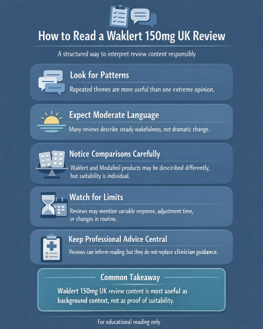Waklert 150mg UK Review infographic showing how UK readers can assess review content by looking for patterns, moderate language, careful comparisons, limits, and professional advice